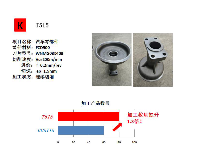 T515主要应用于:汽车零部件、泵体部件、凸轮轴等铸铁材料部件的加工